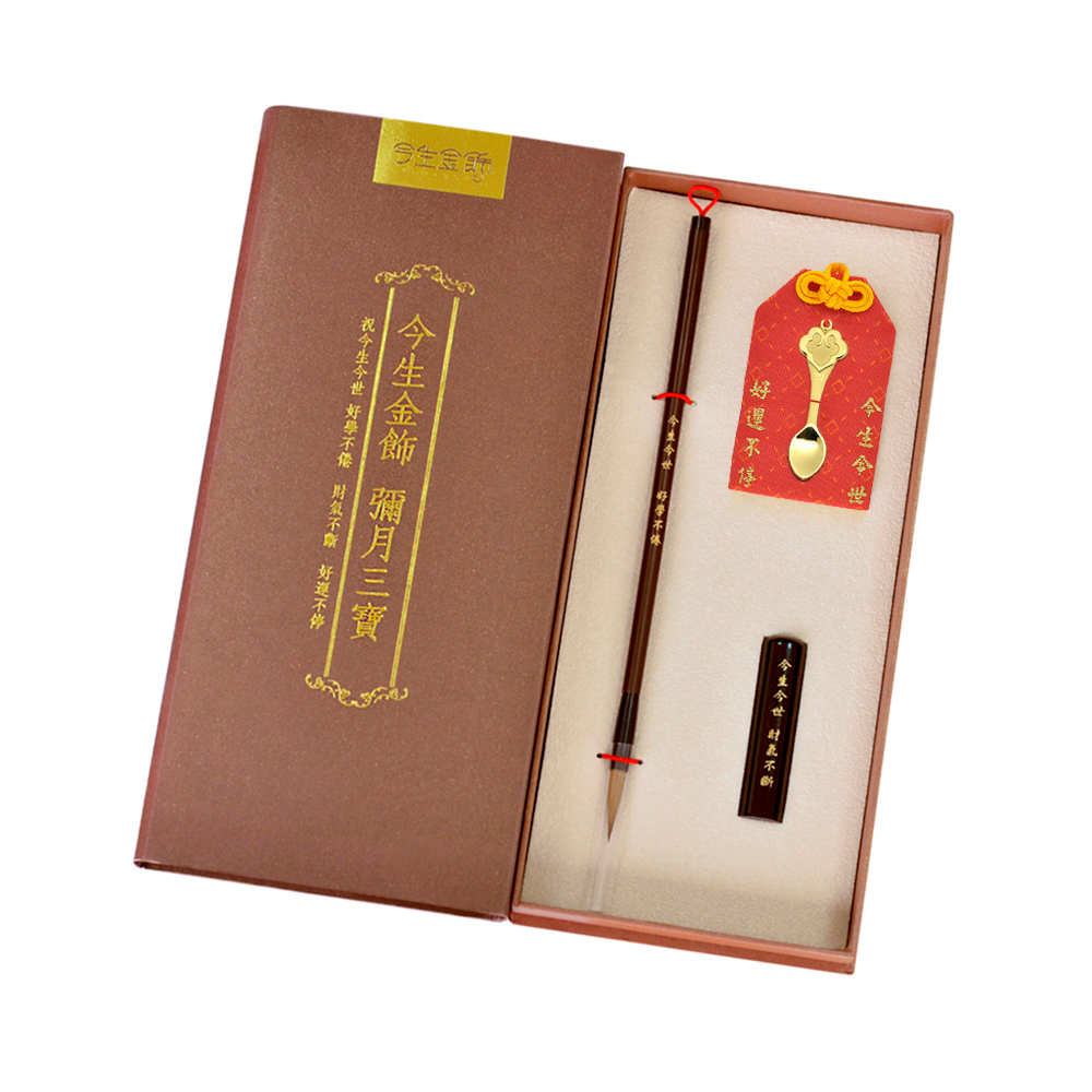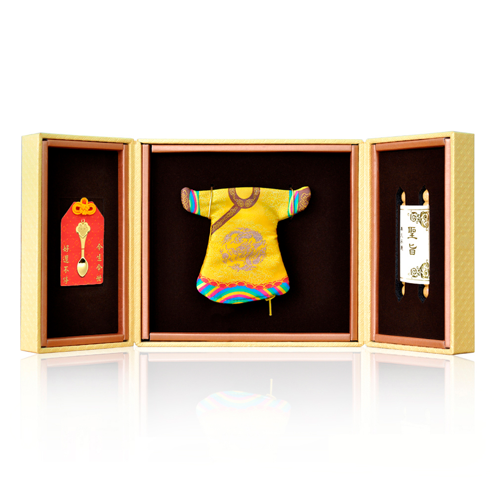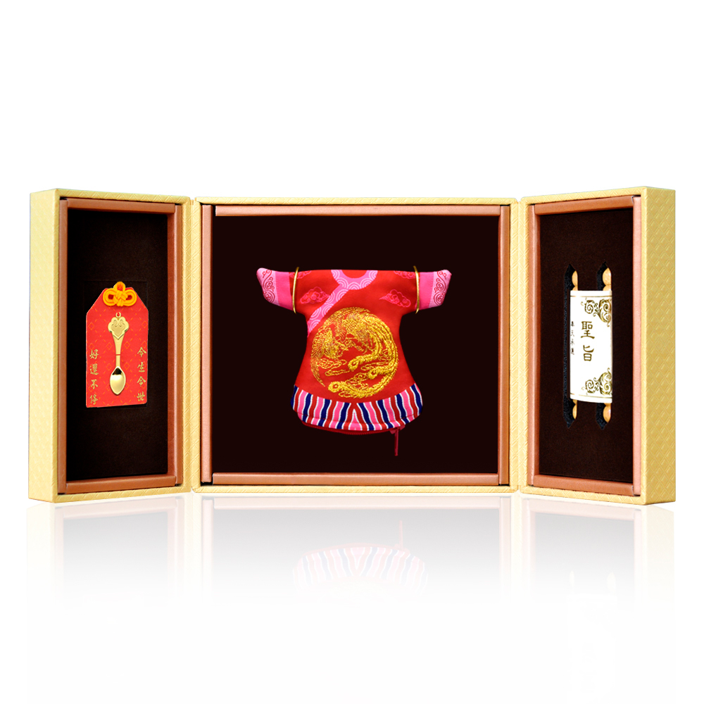 彌月香包縫製;三寶盒:好運印章(無刻印服務),狀元毛筆;龍/鳳袍盒:龍/鳳袍衣服零錢包,聖旨卷軸
