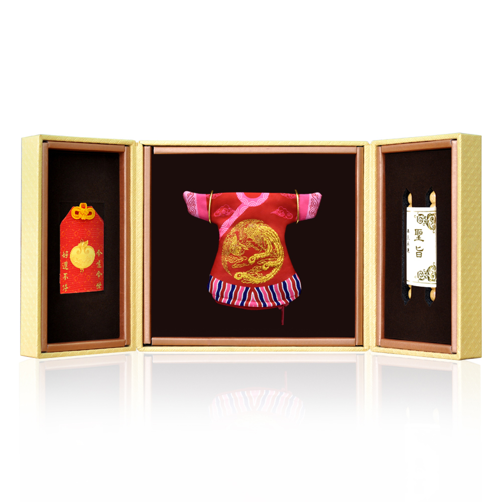 彌月香包縫製;三寶盒:好運印章(無刻印服務),狀元毛筆;龍/鳳袍盒:龍/鳳袍衣服零錢包,聖旨卷軸