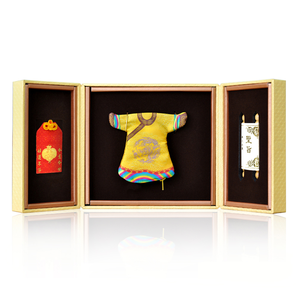 彌月香包縫製;三寶盒:好運印章(無刻印服務),狀元毛筆;龍袍盒:龍袍衣服零錢包,聖旨卷軸