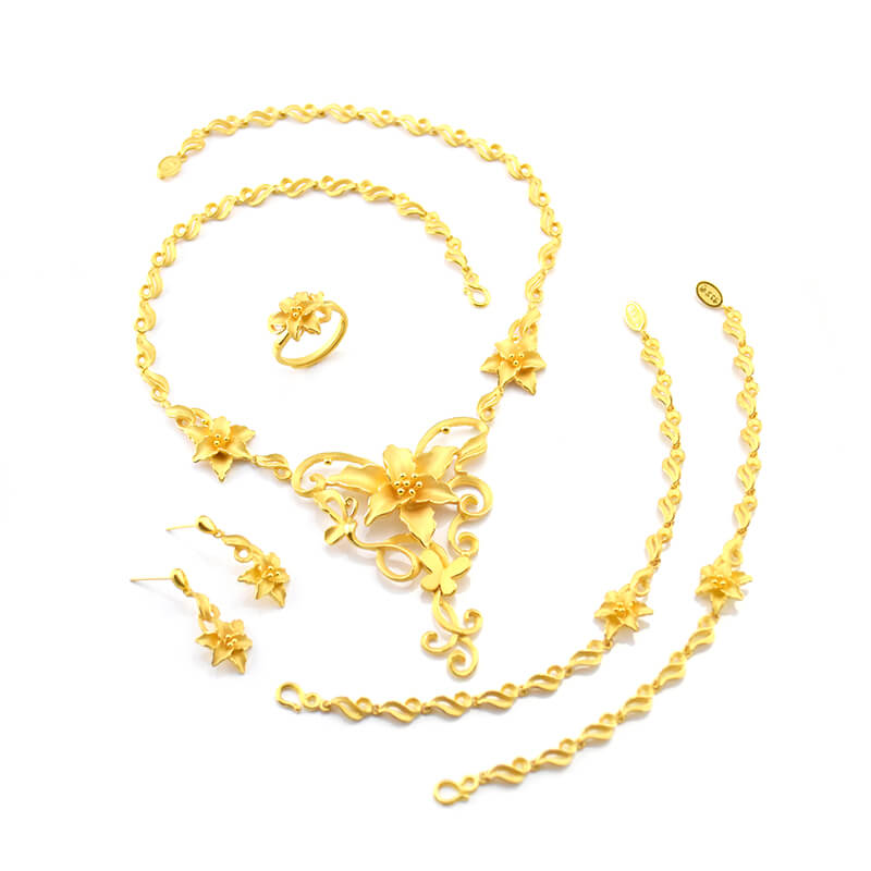概念源於百合花,寓意純潔和善良。百合花元素的金飾賦予新人百年好合的美好,祝願新人好運相伴,富貴相伴。