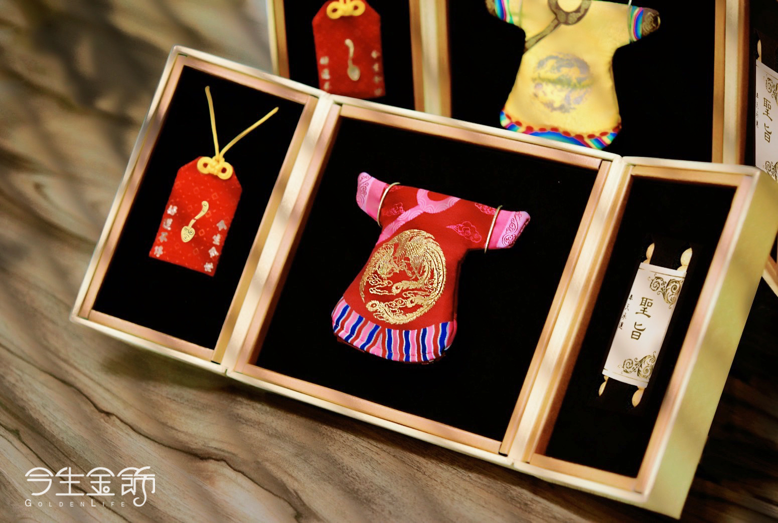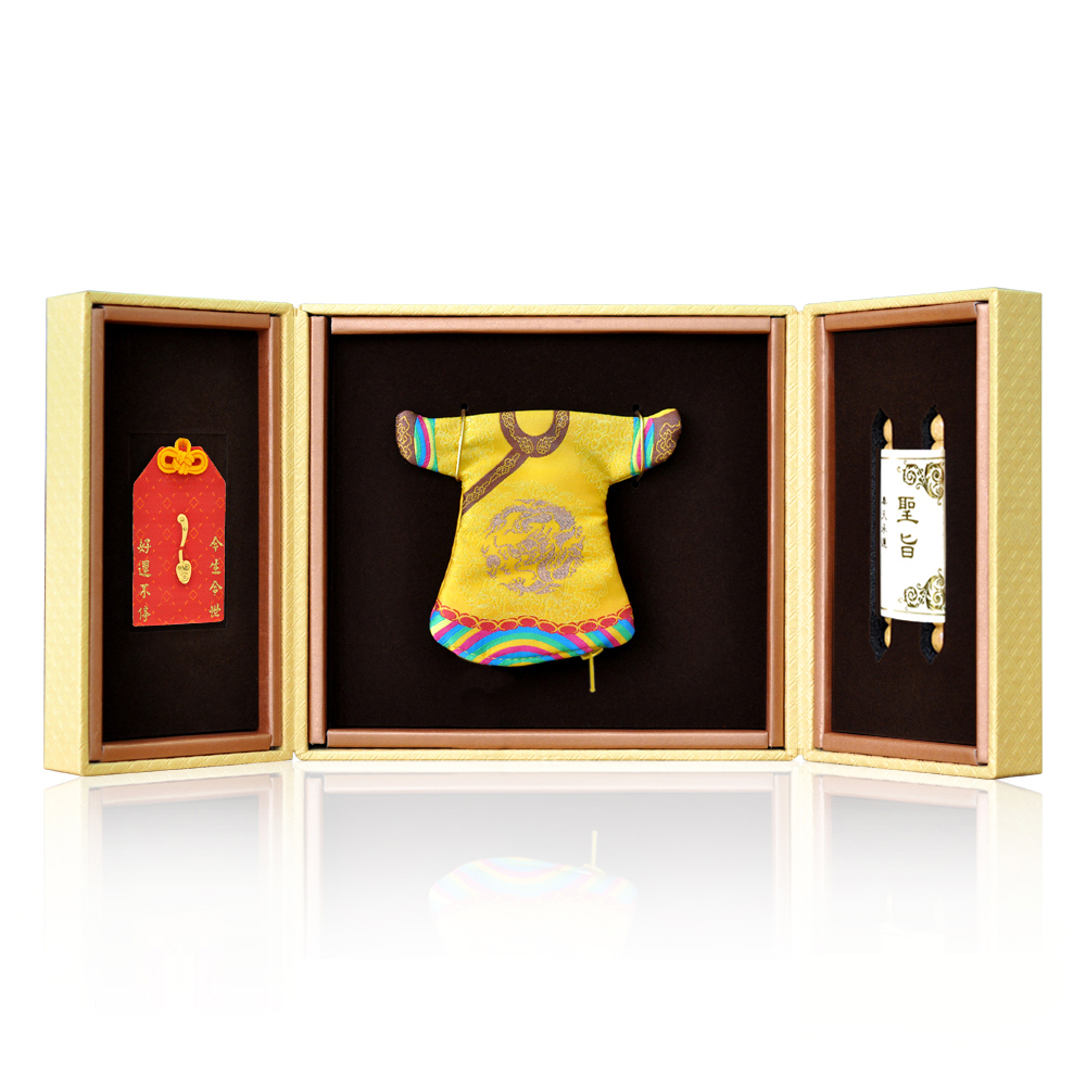 彌月香包縫製;三寶盒:好運印章(無刻印服務),狀元毛筆;龍/鳳袍盒:龍/鳳袍衣服零錢包,聖旨卷軸