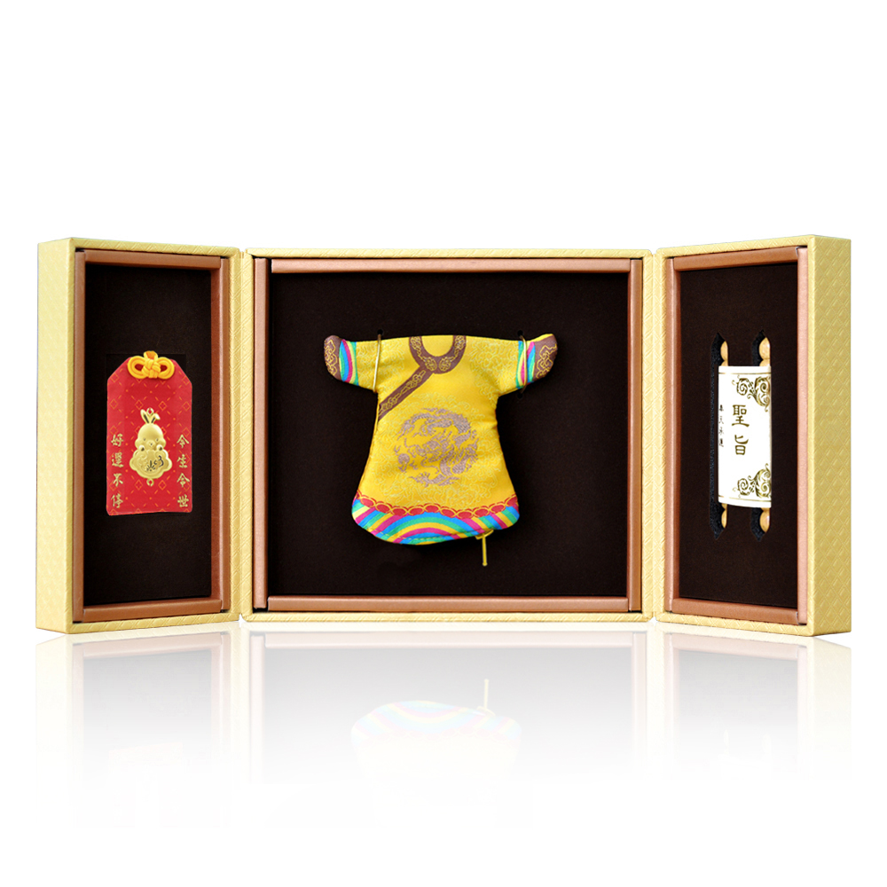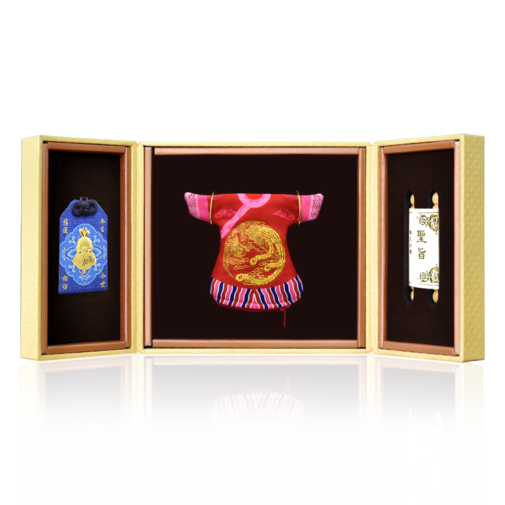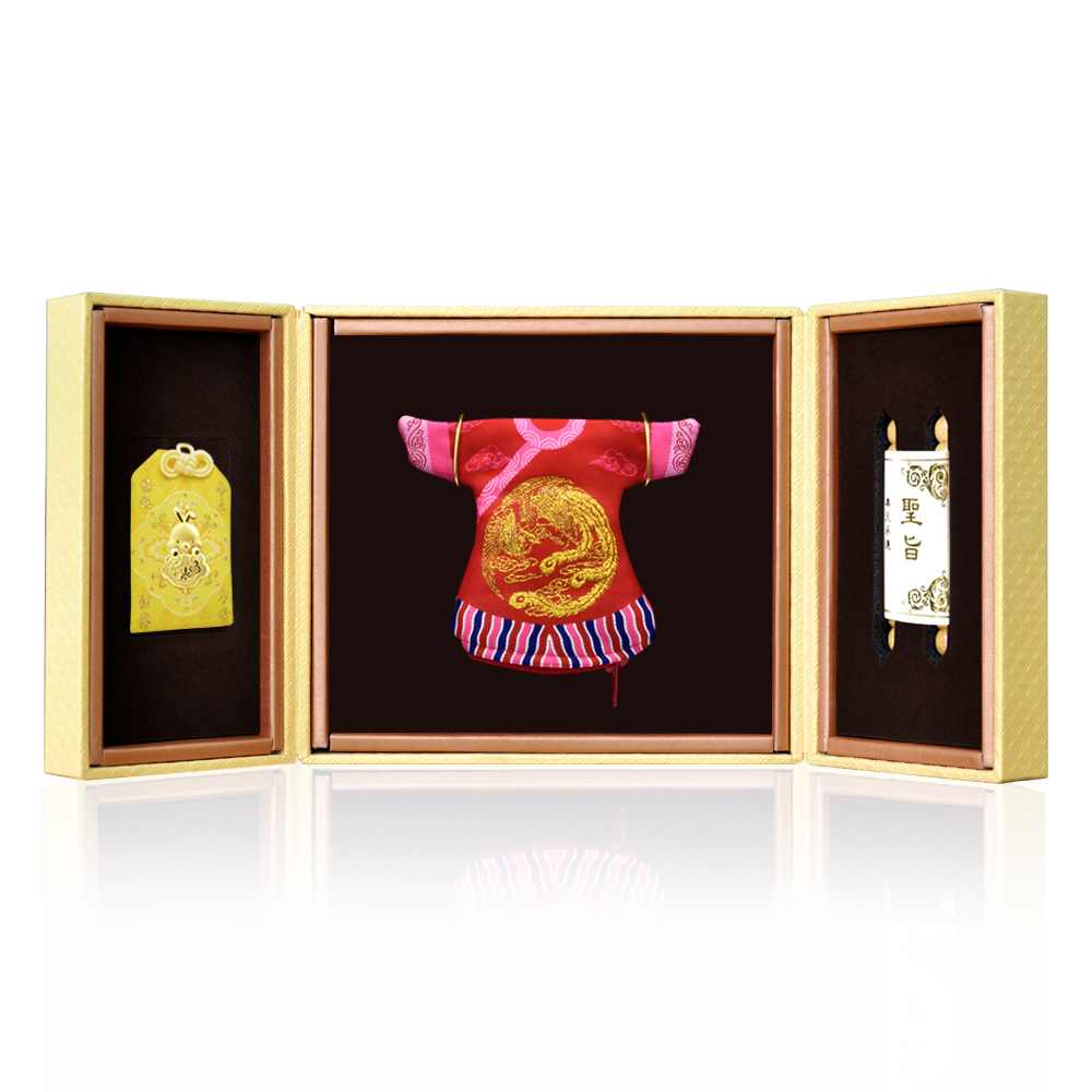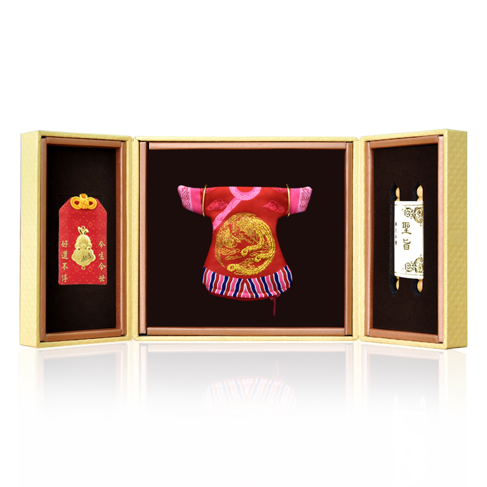彌月香包縫製;三寶盒:好運印章(無刻印服務),狀元毛筆;龍/鳳袍盒:龍/鳳袍衣服零錢包,聖旨卷軸