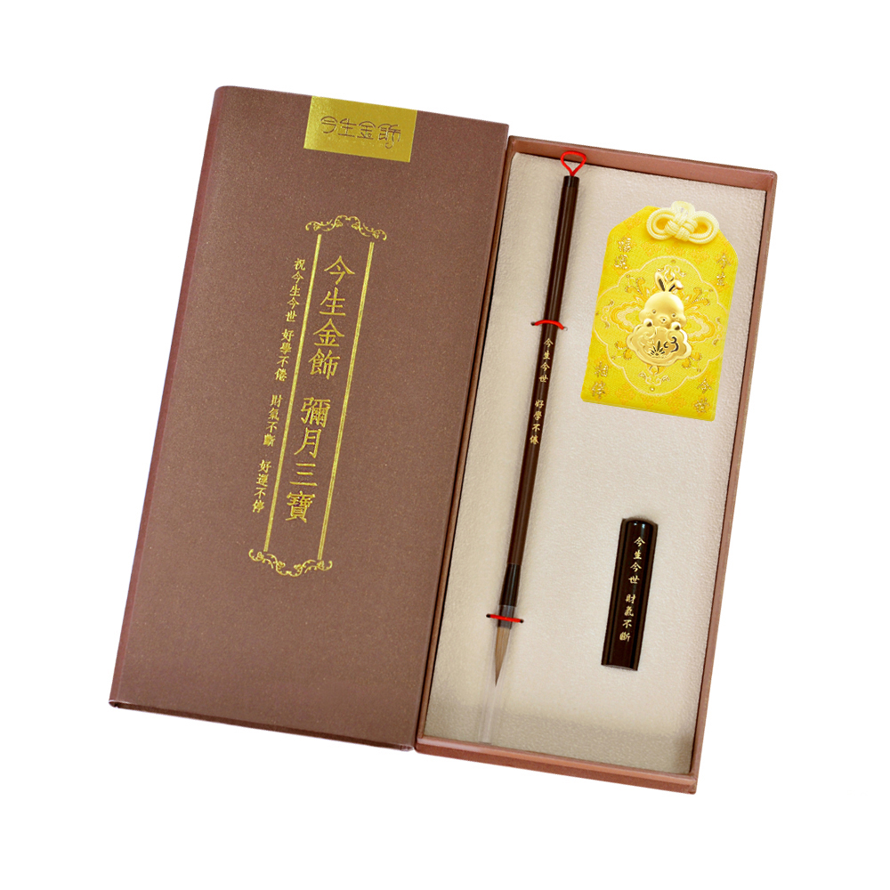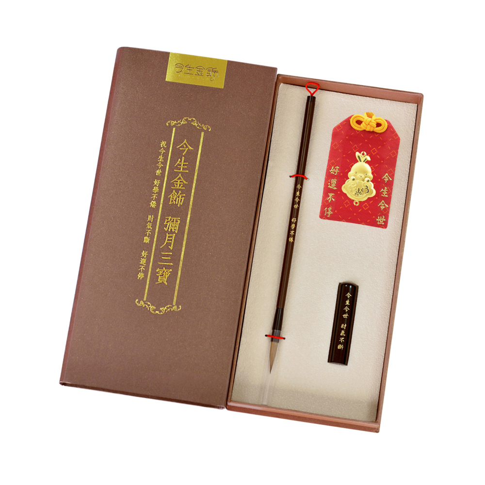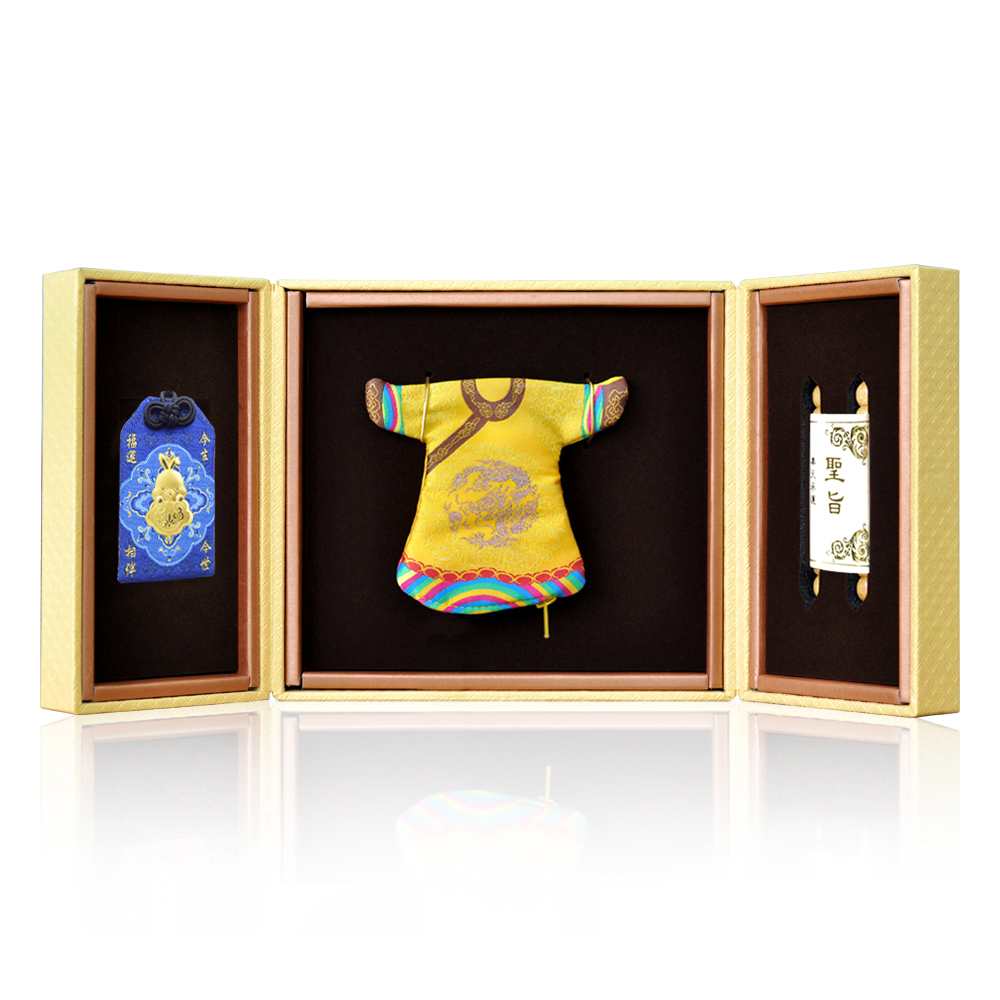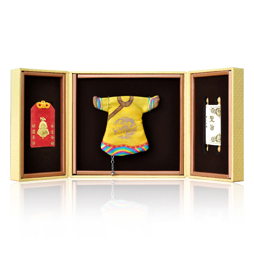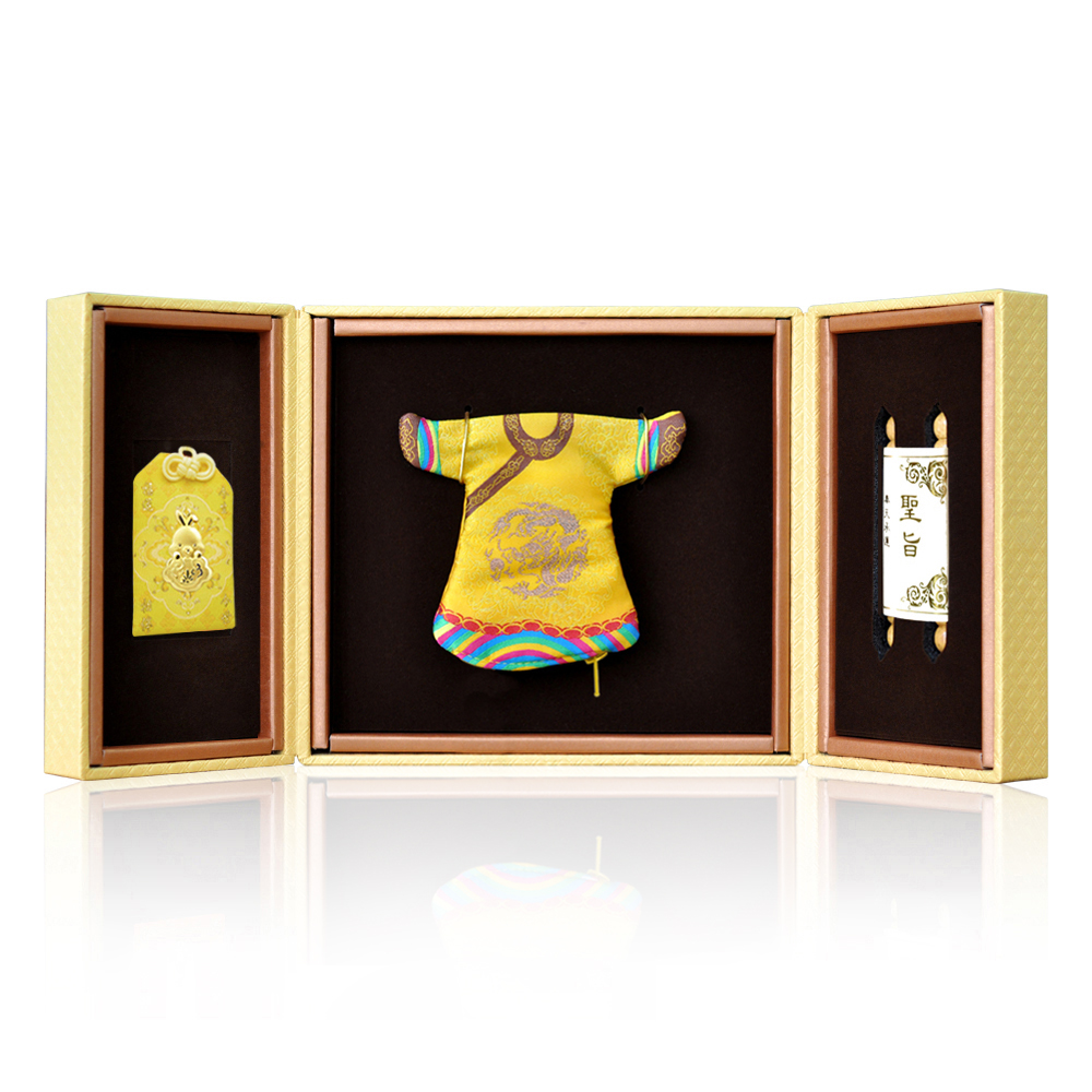 彌月香包縫製;三寶盒:好運印章(無刻印服務),狀元毛筆;龍/鳳袍盒:龍/鳳袍衣服零錢包,聖旨卷軸