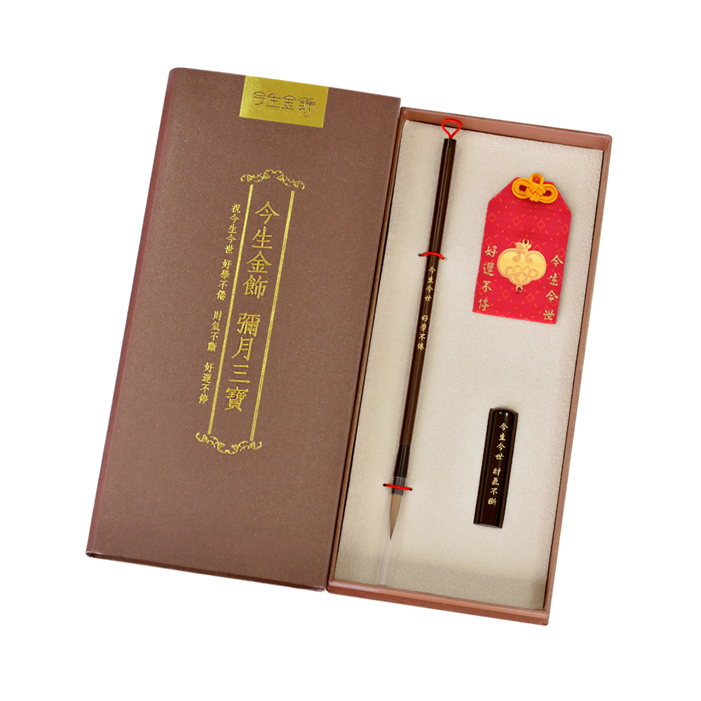 彌月香包縫製;三寶盒:好運印章(無刻印服務),狀元毛筆;龍袍盒:龍袍衣服零錢包,聖旨卷軸