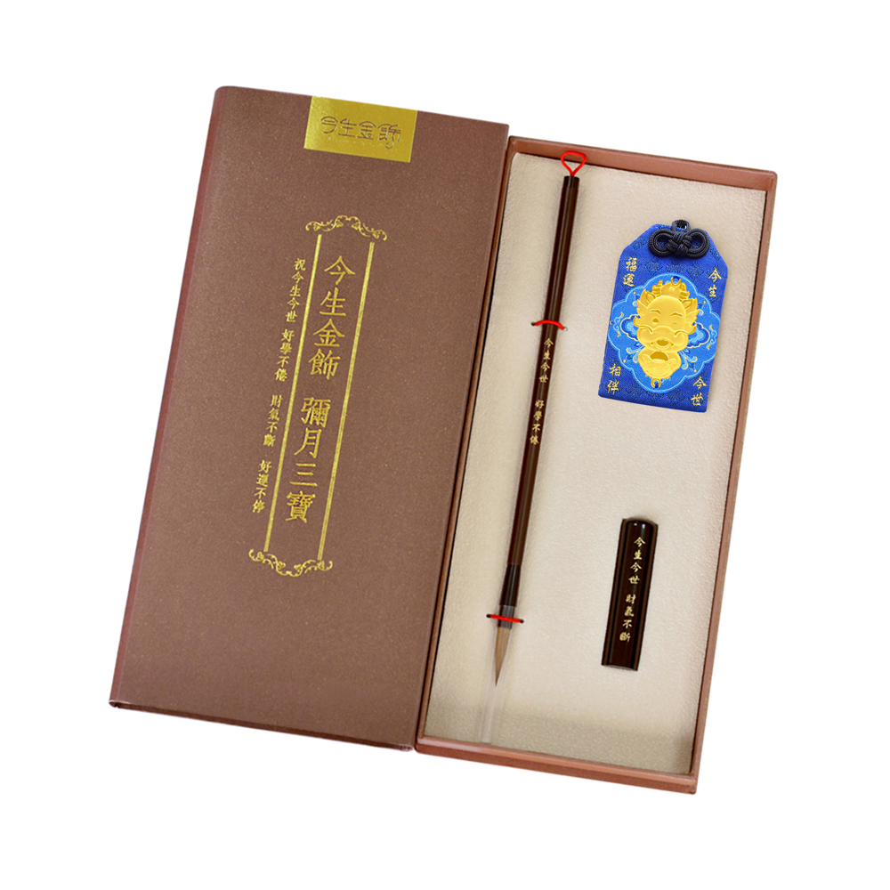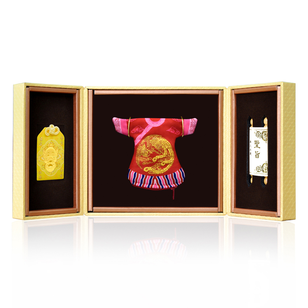 彌月香包縫製;三寶盒:好運印章(無刻印服務),狀元毛筆;龍/鳳袍盒:龍/鳳袍衣服零錢包,聖旨卷軸
